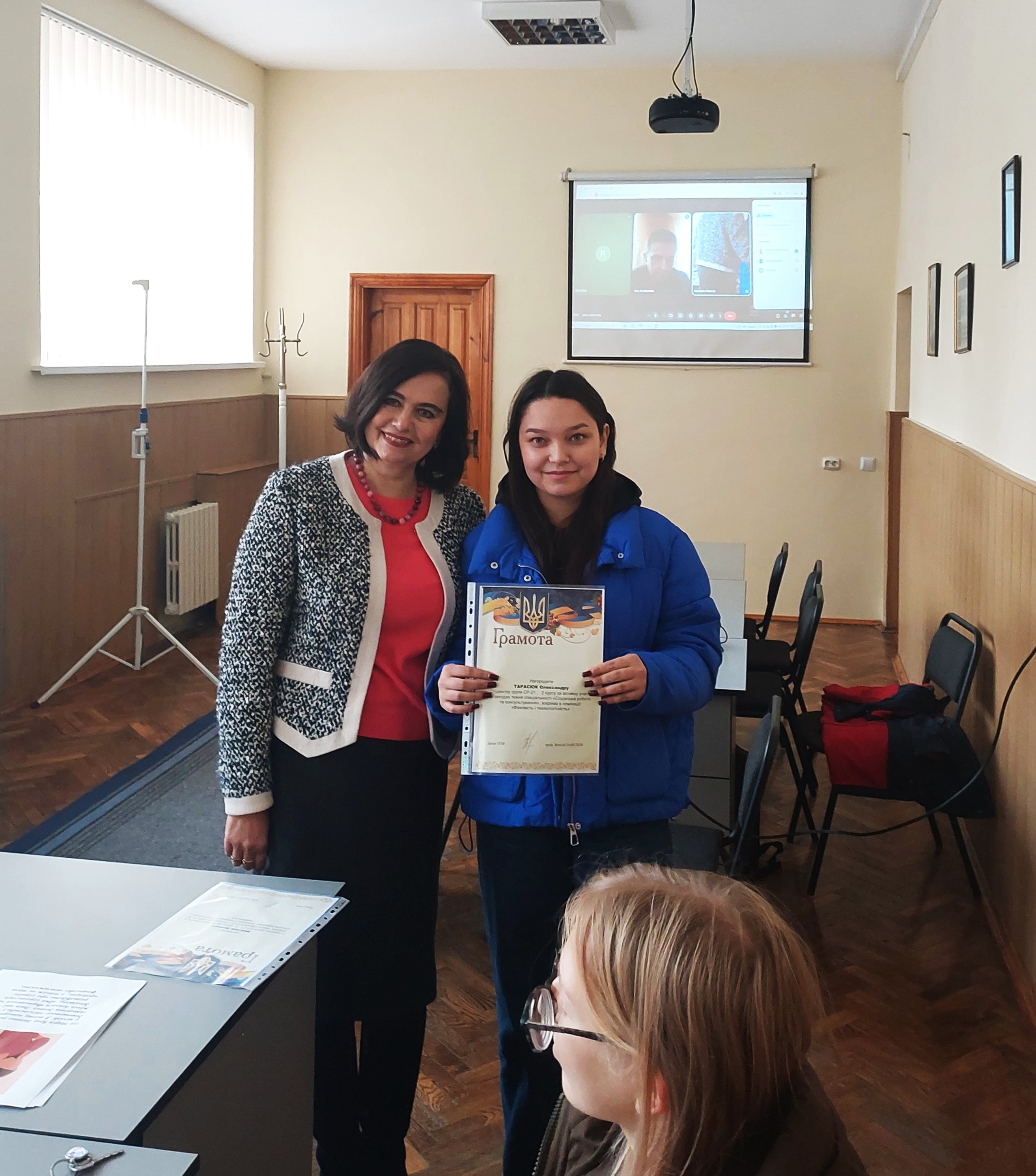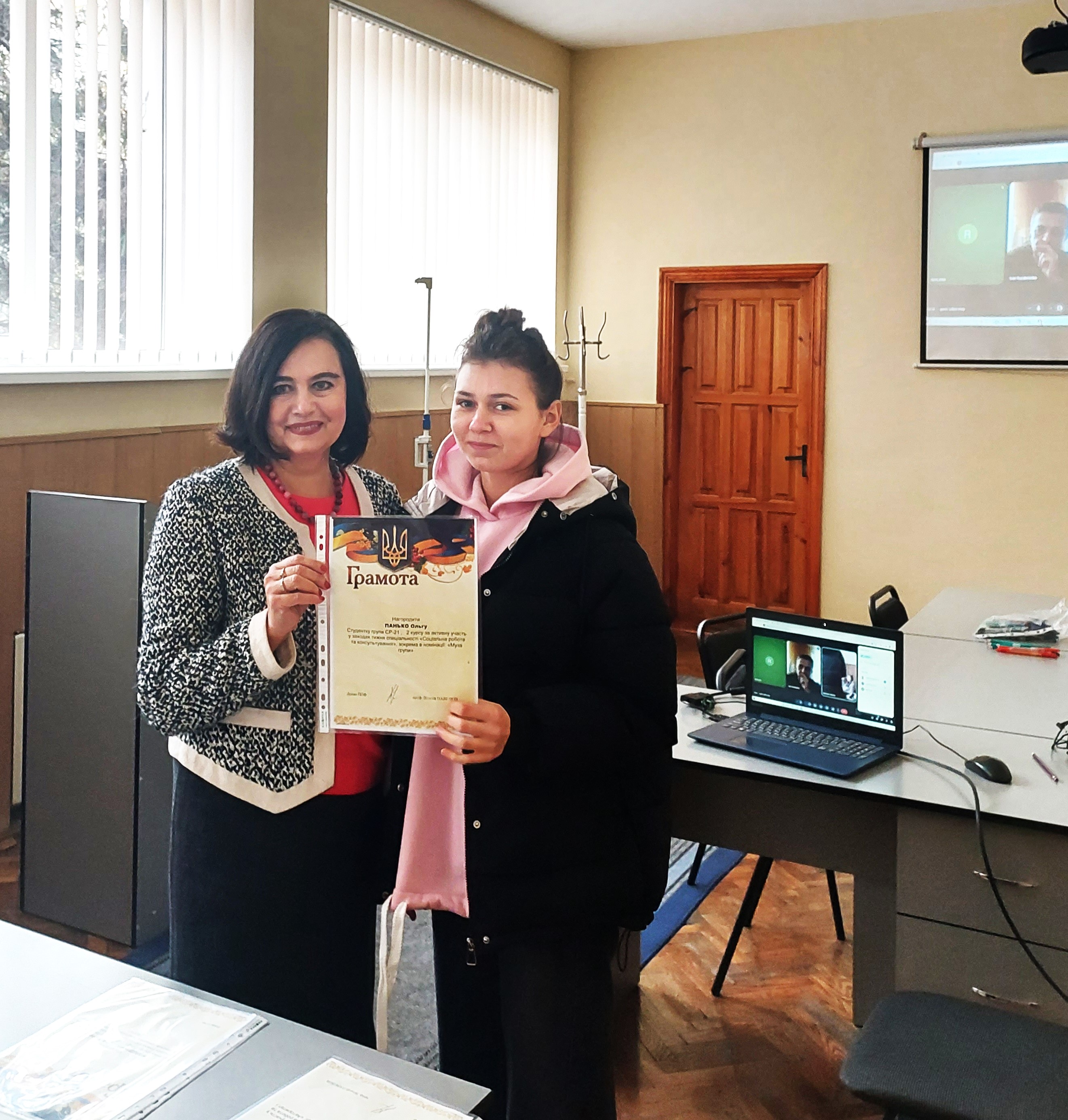 Насамкінець завідувачка кафедри, проф. Ольга Безкоровайна відзначила студентів грамотами в різних номінаціях за активну участь у заходах тижня спеціальності “Соціальна робота та консультування”.